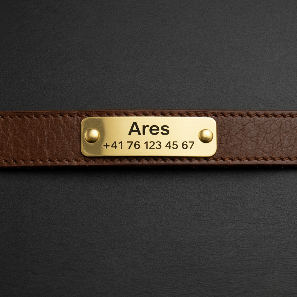 Feste Metall-Namensplatte mit individueller Gravur – kein Anhänger, der klappert oder verloren geht.